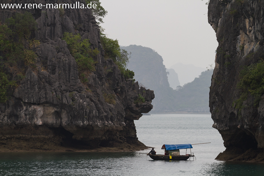 Wir hatten drei Tage in der Halongbucht gebucht. Erkenntnis: Die Schiffe mit Kabinen zur Übernachtung, fahren täglich zum Hafen zurück. Wer die zweite Nacht auf einer Insel verbringen möchte, wird dorthin gebracht. Wer (wie wir) die zweite Nacht wieder auf dem Schiff übernachten möchte, der wird auf einen Tagesauflugschiff gebracht. Zwischenstopp zur Verteilung auf der Insel mit Aussicht. Wie wir am Abend erfuhren: Die Tito-Insel.